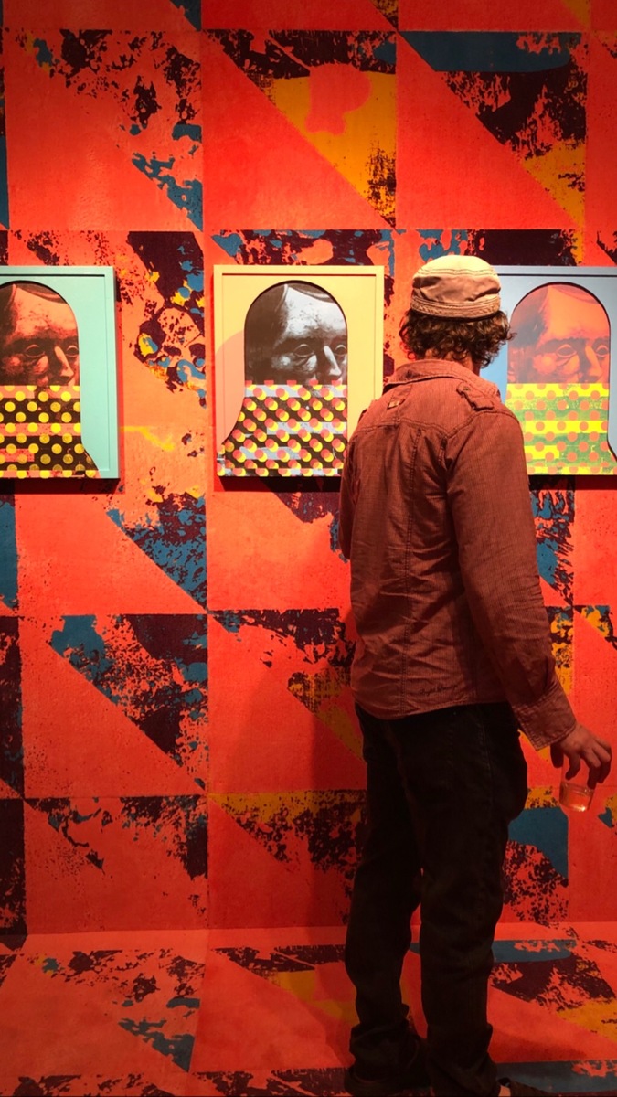 "The centerpiece of the exhibition is an immersive room entirely painted with gnarled triangles that create a rough yet vivid composition. Displayed inside the room are varying sized portraiture depicting realist subjects with flat patterning for a striking contrast. Altogether, the showcase is perhaps one of the artist’s largest to date."